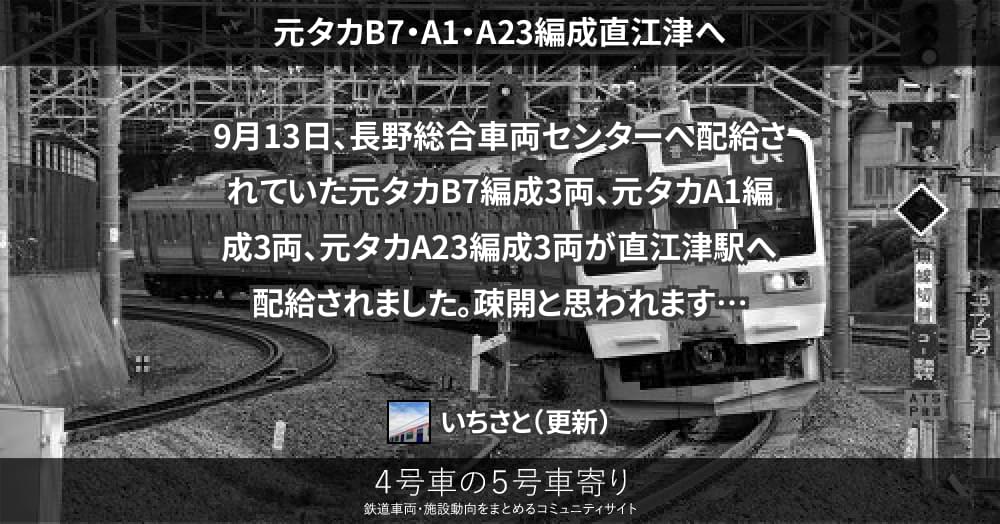 9月13日、長野総合車両センターへ配給されていた元タカB7編成3両、元タカA1編成3両、元タカA23編成3両が直江津駅へ配給されました。疎開と思われます。