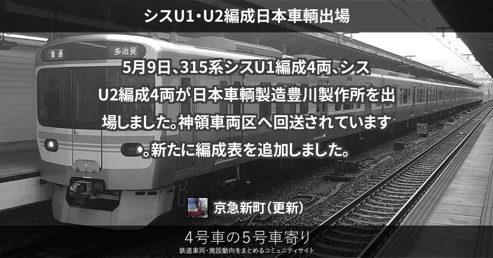 5月9日、315系シスU1編成4両、シスU2編成4両が日本車輌製造豊川製作所を出場しました。神領車両区へ回送されています。