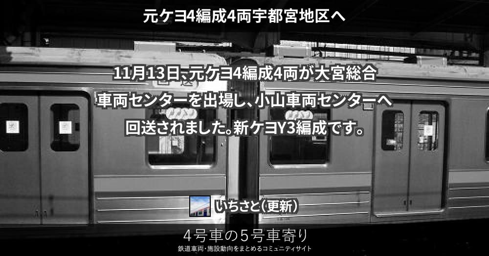11月13日、元ケヨ4編成4両が大宮総合車両センターを出場し、小山車両センターへ回送されました。新ケヨY3編成です。