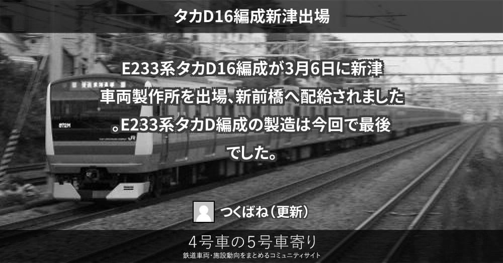 E233系タカD16編成が3月6日に新津車両製作所を出場、新前橋へ配給されました。