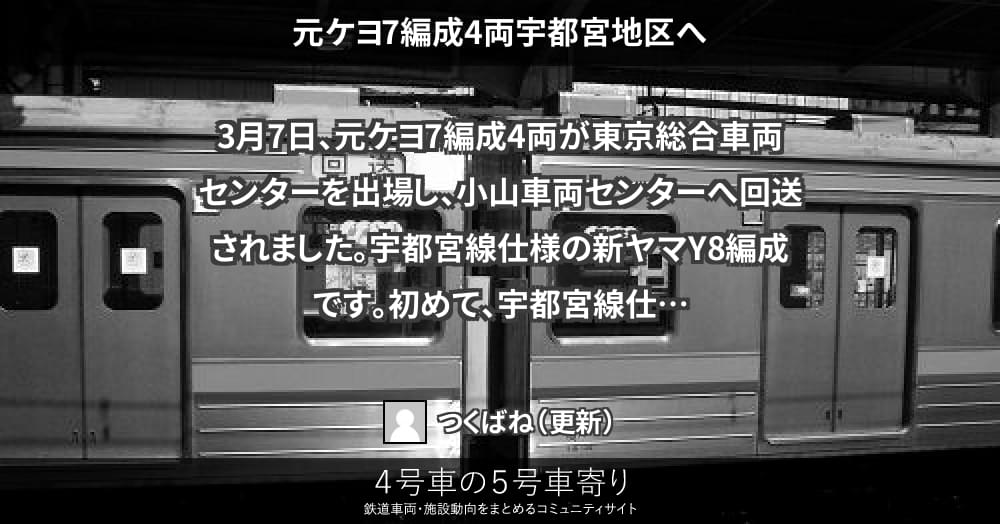 3月7日、元ケヨ7編成4両が東京総合車両センターを出場し、小山車両センターへ回送されました。宇都宮線仕様の新ヤマY8編成です。