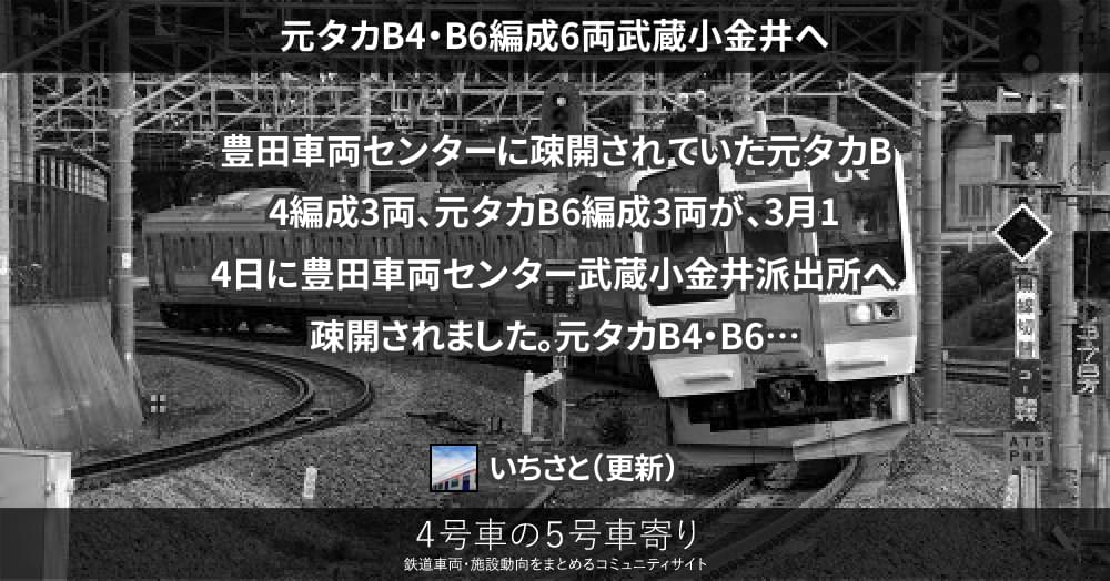 豊田車両センターに疎開されていた元タカB4編成3両、元タカB6編成3両が、3月14日に豊田車両センター武蔵小金井派出所へ疎開されました。元タカB4・B6編成6両は3月11日に高崎車両センターへ返却されていました。