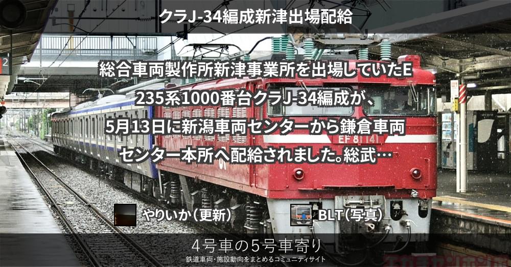 総合車両製作所新津事業所を出場していたE235系1000番台クラJ-34編成が、5月13日に新潟車両センターから鎌倉車両センター本所へ配給されました。