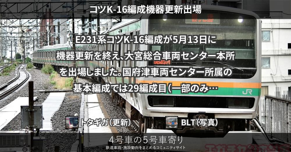 5/13、E231系近郊タイプのコツK-16編成が大宮総合車両センター本所を出場し、湘南方面へ自走で回送されてます。2022/12/21に戸閉装置などの一部機器の更新をしており、今回、残りの床下主要機器を含めた全ての機器更新、およびホームド...