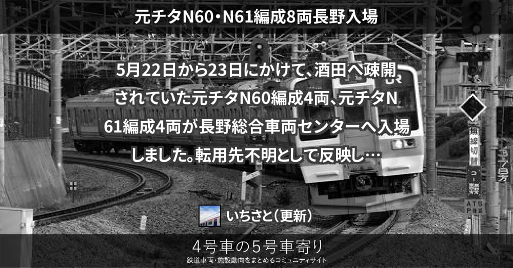 5月22日から23日にかけて、酒田へ疎開されていた元チタN60編成4両、元チタN61編成4両が長野総合車両センターへ入場しました。転用先不明として反映していますが、新潟以外考えにくいので、近いうちにその旨、変更していこうと思います。