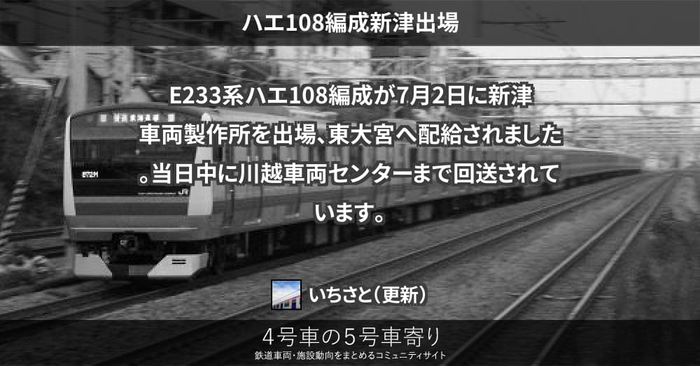 E233系E233系ハエ108編成が7月2日に新津車両製作所を出場、東大宮へ配給されました。当日中に川越車両センターまで回送されています。