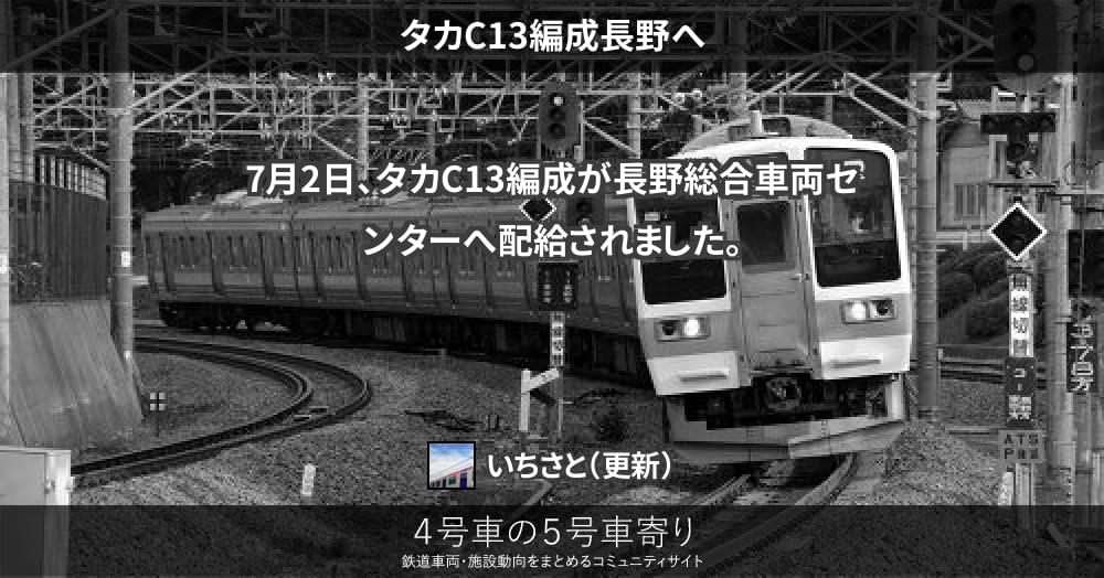 211系(東) ページ目次 タカC13編成長野へ 更新コンテンツ サイト投稿写真 2013/07/02 タカC13編成長野へ 7月2日、タカC13編成が長野総合車両センターへ配給されました。 更新コンテンツ 404 Not Found 上記コンテンツ傘下のページも含みます。 サイト投稿写真 投稿画像がありません。211系(東)グループのアップローダーへ投稿頂いた写真は、こちらでご紹介致します。