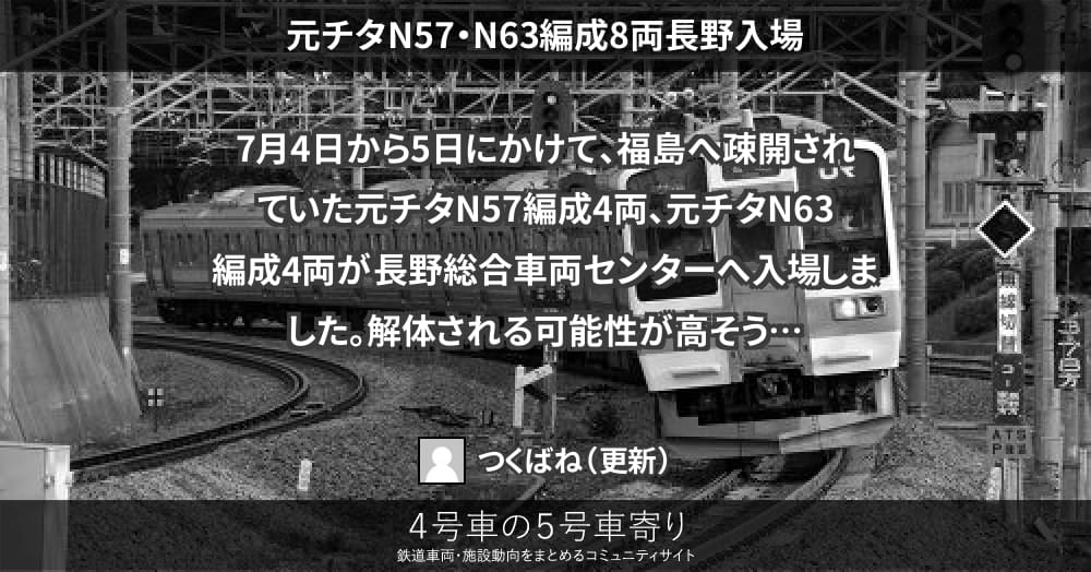7月4日から5日にかけて、福島へ疎開されていた元チタN57編成4両、元チタN63編成4両が長野総合車両センターへ入場しました。解体される可能性が高そうです。