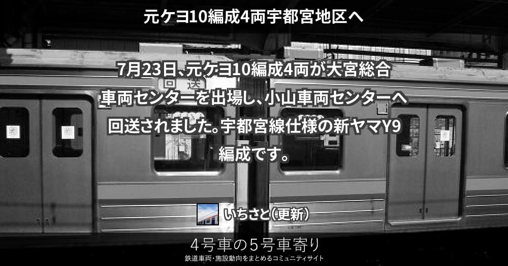 7月23日、元ケヨ10編成4両が大宮総合車両センターを出場し、小山車両センターへ回送されました。宇都宮線仕様の新ヤマY9編成です。