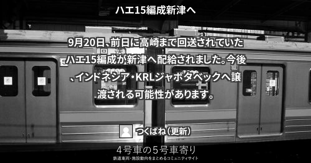 9月20日、前日に高崎まで回送されていたハエ15編成が新津へ配給されました。今後、インドネシア・KRLジャボタベックへ譲渡される可能性があります。