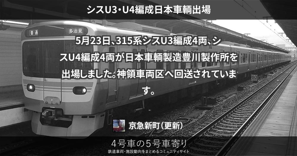 5月23日、315系シスU3編成4両、シスU4編成4両が日本車輌製造豊川製作所を出場しました。神領車両区へ回送されています。