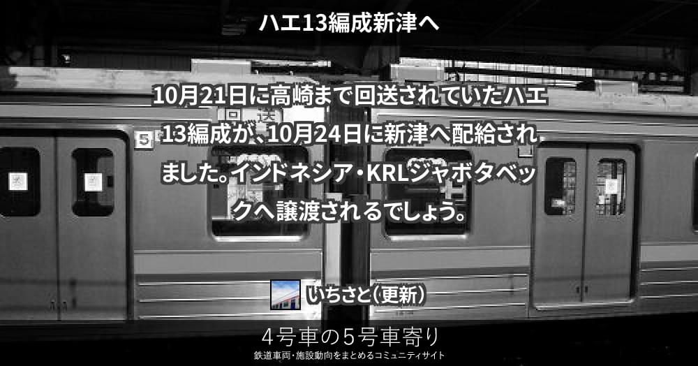 10月21日に高崎まで回送されていたハエ13編成が、10月24日に新津へ配給されました。インドネシア・KRLジャボタベックへ譲渡されるでしょう。