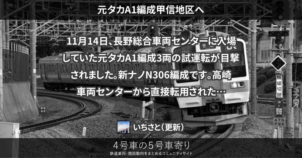 11月14日、長野総合車両センターに入場していた元タカA1編成3両の試運転が目撃されました。新ナノN306編成です。