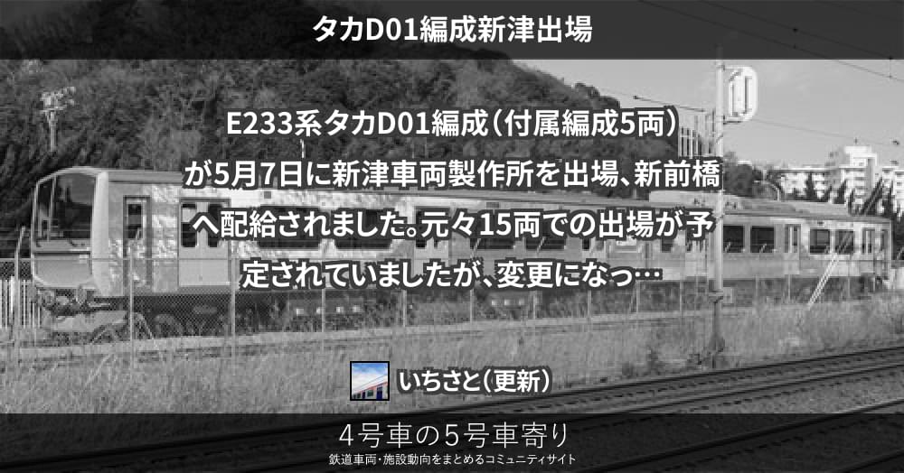 JRの車両その他(東)E233系タカD01編成(付属編成5両)が5月7日に新津車両製作所を出場、新前橋へ配給されました。