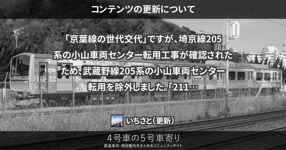 「京葉線の世代交代」ですが、埼京線205系の小山車両センター転用工事が確認されたため、武蔵野線205系の小山車両センター転用を除外しました。