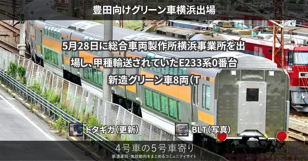 5月28日に総合車両製作所横浜事業所を出場し、甲種輸送されていたE233系0番台新造グリーン車8両(TsdTsd'33~36)が、29日に豊田へ到着しました。