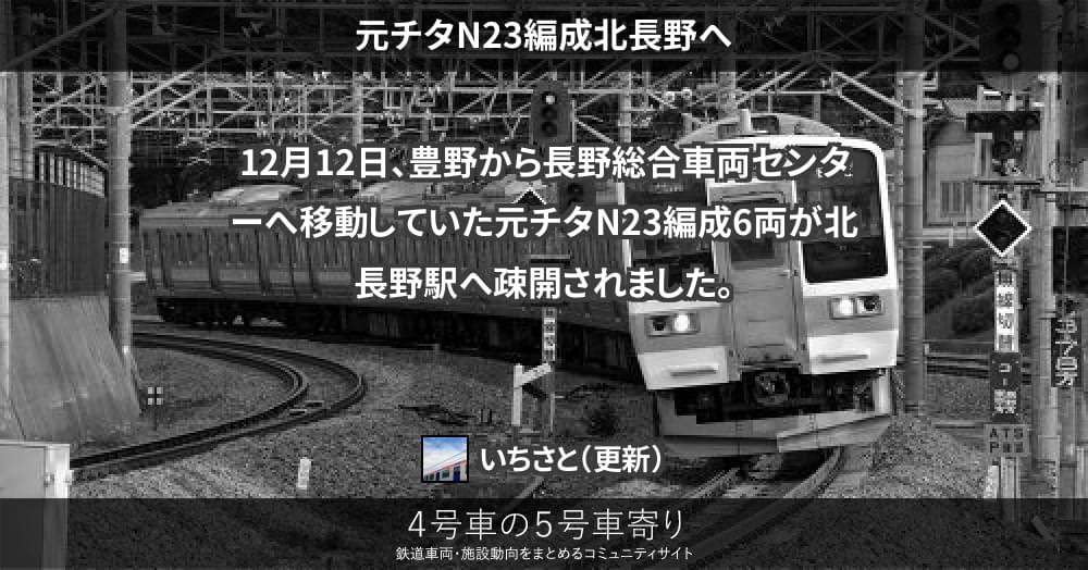 211系(東) ページ目次 元チタN23編成北長野へ 更新コンテンツ サイト投稿写真 2013/12/12 元チタN23編成北長野へ 12月12日、豊野から長野総合車両センターへ移動していた元チタN23編成6両が北長野駅へ疎開されました。 更新コンテンツ 404 Not Found 上記コンテンツ傘下のページも含みます。 サイト投稿写真 投稿画像がありません。211系(東)グループのアップローダーへ投稿頂いた写真は、こちらでご紹介致します。