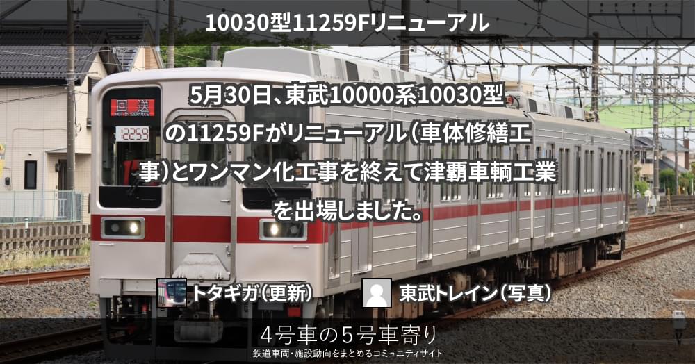 5月30日、東武10000系10030型の11259Fがリニューアル(車体修繕工事)とワンマン化工事を終えて津覇車輌工業を出場しました。