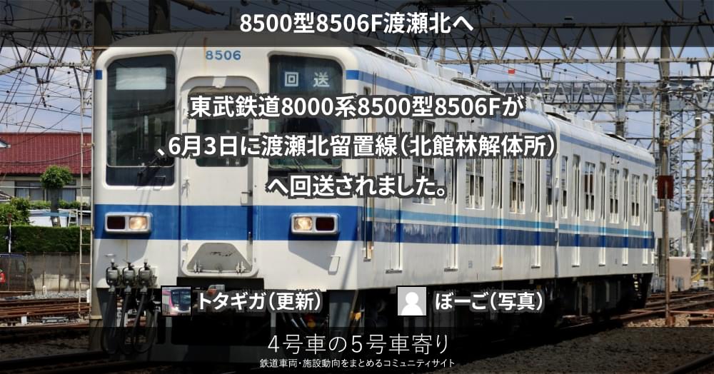 東武鉄道8000系8500型8506Fが、6月3日に渡瀬北留置線(北館林解体所)へ回送されました。