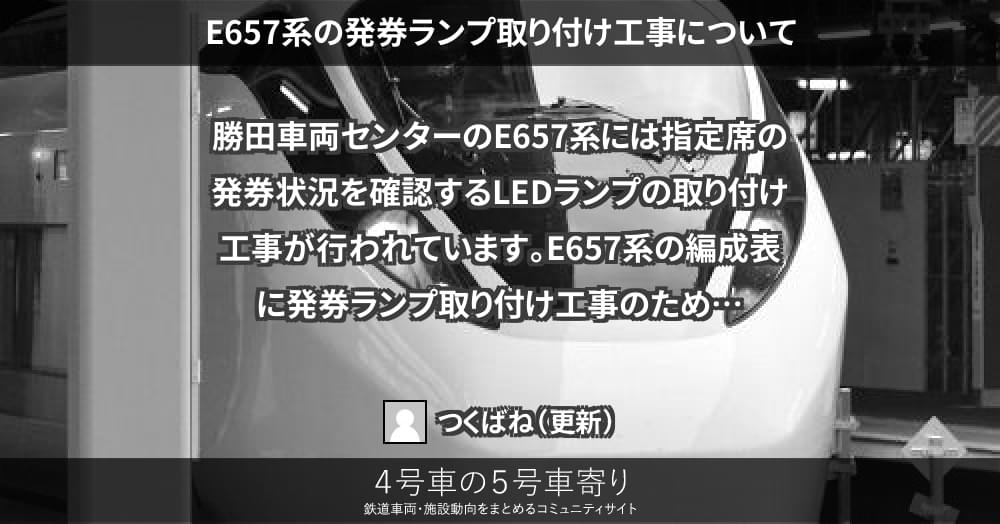 勝田車両センターのE657系には指定席の発券状況を確認するLEDランプの取り付け工事が行われています。E657系の編成表に発券ランプ取り付け工事のための勝田入出場の日付を追加しました。