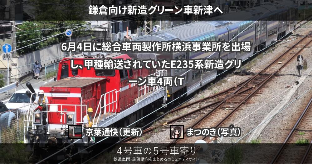 6/4未明(6/3終車後)、E235系1000番台のグリーン車4両が、総合車両製作所横浜事業所(J-TREC横浜)を出場しました。今回も2組分4両の出場で、車番からクラF-41編成、クラF-42編成に組み込まれると見られます。近いうちに新津...