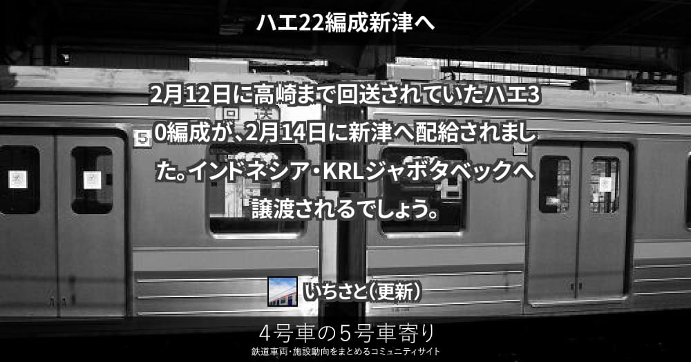 205系(東) ページ目次 ハエ22編成新津へ 更新コンテンツ サイト投稿写真 2014/02/14 ハエ22編成新津へ 2月12日に高崎まで回送されていたハエ30編成が、2月14日に新津へ配給されました。インドネシア・KRLジャボタベックへ譲渡されるでしょう。 更新コンテンツ 404 Not Found 上記コンテンツ傘下のページも含みます。 サイト投稿写真 投稿画像がありません。205系(東)グループのアップローダーへ投稿頂いた写真は、こちらでご紹介致します。