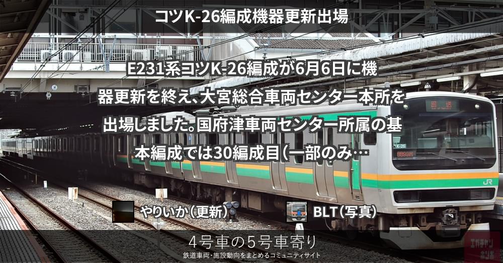 本日(6/6)、E231系近郊タイプのコツK-26編成が、大宮総合車両センター本所を出場しました。今回の入場では床下主要機器の更新やホームドア対応改造が行われています。なお、2022年3月に戸閉装置等の一部機器のみの更新を東京総合車両センタ...