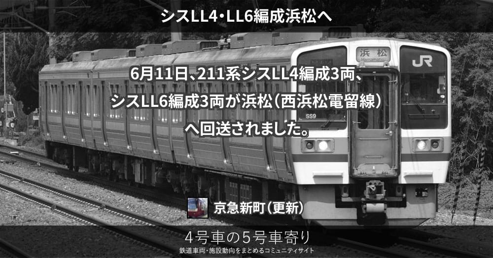 6月11日、211系シスLL4編成3両、シスLL6編成3両が浜松(西浜松電留線)へ回送されました。