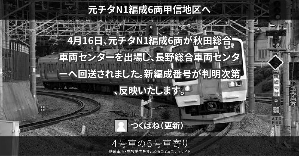 4月16日、元チタN1編成6両が秋田総合車両センターを出場し、長野総合車両センターへ回送されました。新編成番号が判明次第、反映いたします。