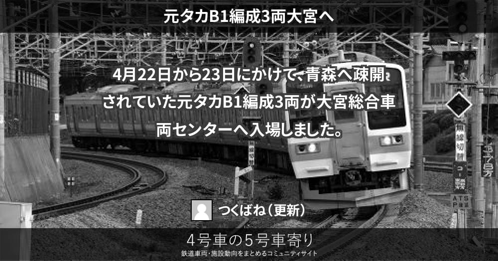 4月22日から23日にかけて、青森へ疎開されていた元タカB1編成3両が大宮総合車両センターへ入場しました。