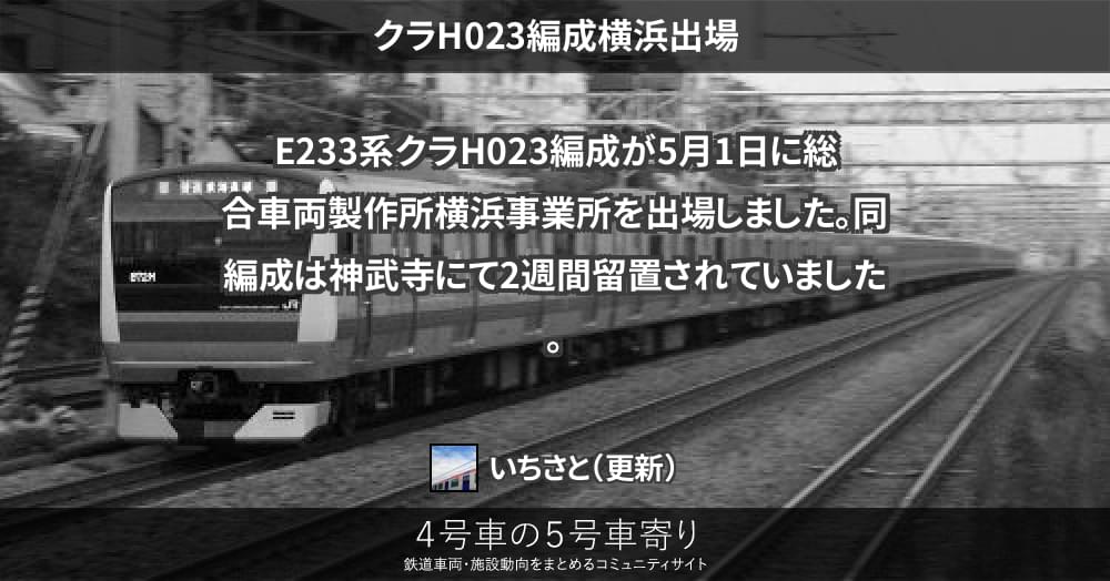 E233系E233系クラH023編成が5月1日に総合車両製作所横浜事業所を出場しました。同編成は神武寺にて2週間留置されていました。