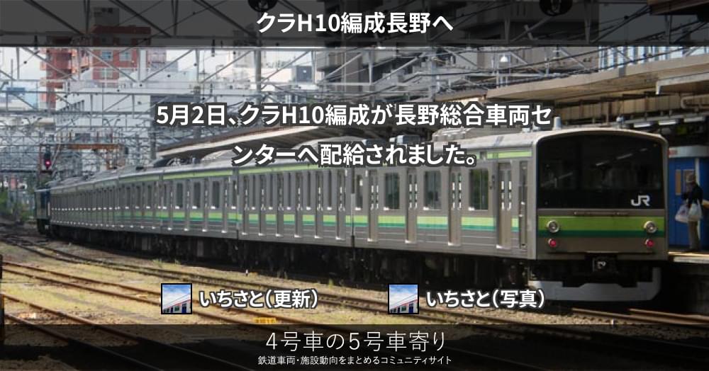 205系(東) ページ目次 クラH10編成長野へ 更新コンテンツ サイト投稿写真 2014/05/02 クラH10編成長野へ 5月2日、クラH10編成が長野総合車両センターへ配給されました。 更新コンテンツ 205系鎌倉車両センター本所編成表(配置消滅)現在の配置はありません。2014年8月23日までに全編成が運用を離脱しました。横浜線車両の転出先は転出編成表もご参考にどうぞ。【過去の編成形態】 上記コンテンツ傘下のページも含みます。 サイト投稿写真 いちさと 撮影者サイト未設定 牽引はEF64-1030でした。 いちさと 撮影者サイト未設定 クラH10編成(奥)を見送るクラH18編成(手前)。