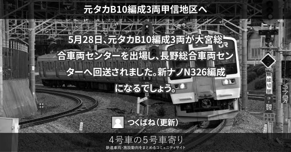 5月28日、元タカB10編成3両が大宮総合車両センターを出場し、長野総合車両センターへ回送されました。新ナノN326編成になるでしょう。