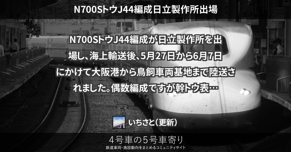 N700SトウJ44編成が日立製作所を出場し、海上輸送後、5月27日から6月7日にかけて大阪港から鳥飼車両基地まで陸送されました。