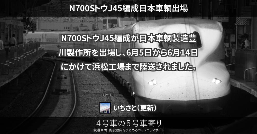 N700SトウJ45編成が日本車輌製造豊川製作所を出場し、6月5日から6月14日にかけて浜松工場まで陸送されました。