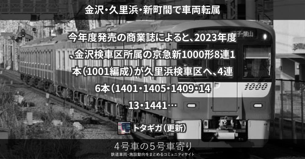 今年度発売の商業誌によると、2023年度、金沢検車区所属の京急新1000形8連1本(1001編成)が久里浜検車区へ、4連6本(1401・1405・1409・1413・1441・1445編成)が新町検車区へ、新町検車区所属の京急新1000形4連4本(1465・1481・1485・1489編成)が金沢検車区へ、それぞれ転属しました。