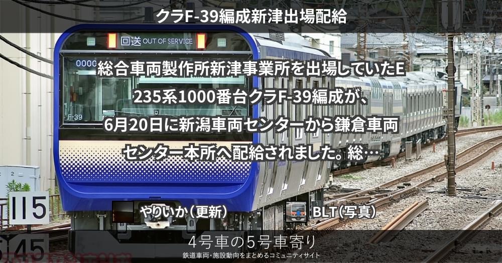 総合車両製作所新津事業所を出場していたE235系1000番台クラF-39編成が、6月20日に新潟車両センターから鎌倉車両センター本所へ配給されました。