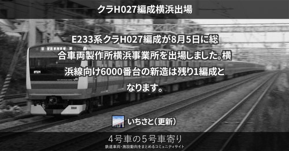 E233系E233系クラH027編成が8月5日に総合車両製作所横浜事業所を出場しました。横浜線向け6000番台の新造は残り1編成となります。