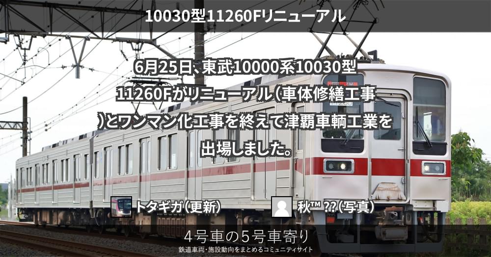 6月25日、東武10000系10030型11260Fがリニューアル(車体修繕工事)とワンマン化工事を終えて津覇車輌工業を出場しました。