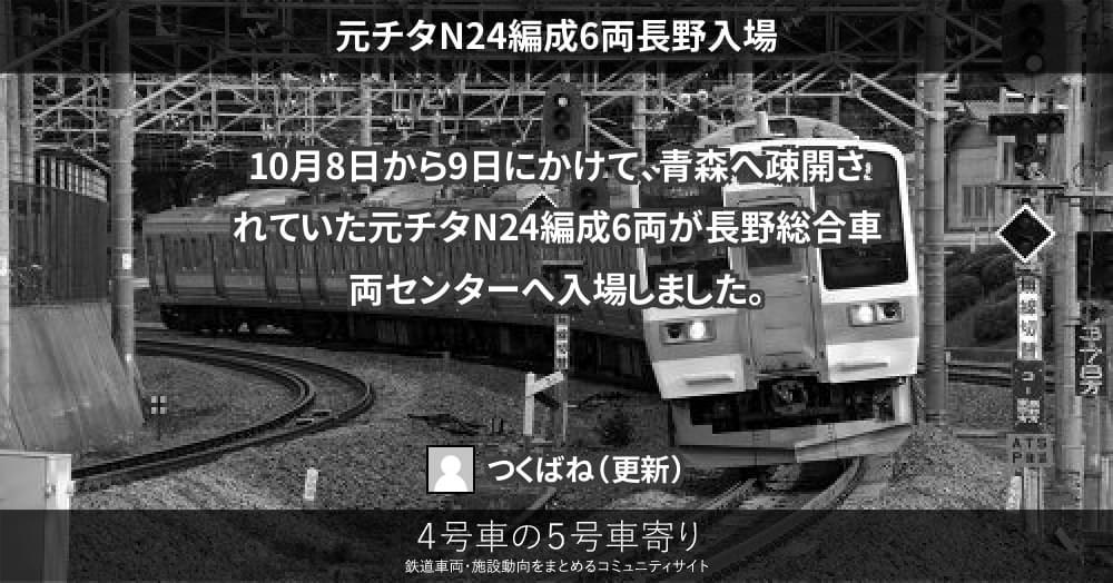 211系(東) ページ目次 元チタN24編成6両長野入場 更新コンテンツ サイト投稿写真 2014/10/08 元チタN24編成6両長野入場 10月8日から9日にかけて、青森へ疎開されていた元チタN24編成6両が長野総合車両センターへ入場しました。 更新コンテンツ 404 Not Found 上記コンテンツ傘下のページも含みます。 サイト投稿写真 投稿画像がありません。211系(東)グループのアップローダーへ投稿頂いた写真は、こちらでご紹介致します。
