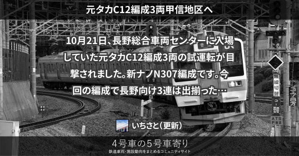 10月21日、長野総合車両センターに入場していた元タカC12編成3両の試運転が目撃されました。新ナノN307編成です。