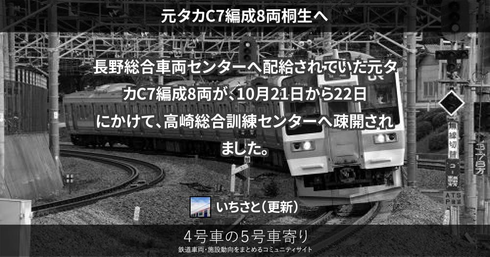 長野総合車両センターへ配給されていた元タカC7編成8両が、10月21日から22日にかけて、高崎総合訓練センターへ疎開されました。
