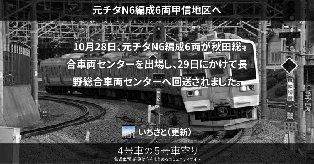 211系(東) ページ目次 元チタN6編成6両甲信地区へ 更新コンテンツ サイト投稿写真 2014/10/28 元チタN6編成6両甲信地区へ 10月28日、元チタN6編成6両が秋田総合車両センターを出場し、29日にかけて長野総合車両センターへ回送されました。 更新コンテンツ 404 Not Found 上記コンテンツ傘下のページも含みます。 サイト投稿写真 投稿画像がありません。211系(東)グループのアップローダーへ投稿頂いた写真は、こちらでご紹介致します。
