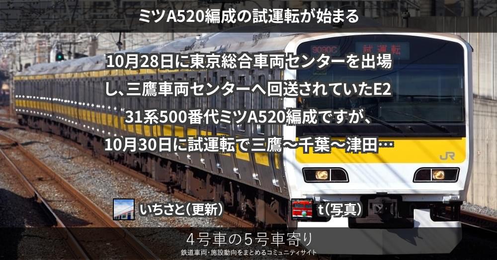 10月28日に東京総合車両センターを出場し、三鷹車両センターへ回送されていたE231系500番代ミツA520編成ですが、10月30日に試運転で三鷹~千葉~津田沼を走行しました。
