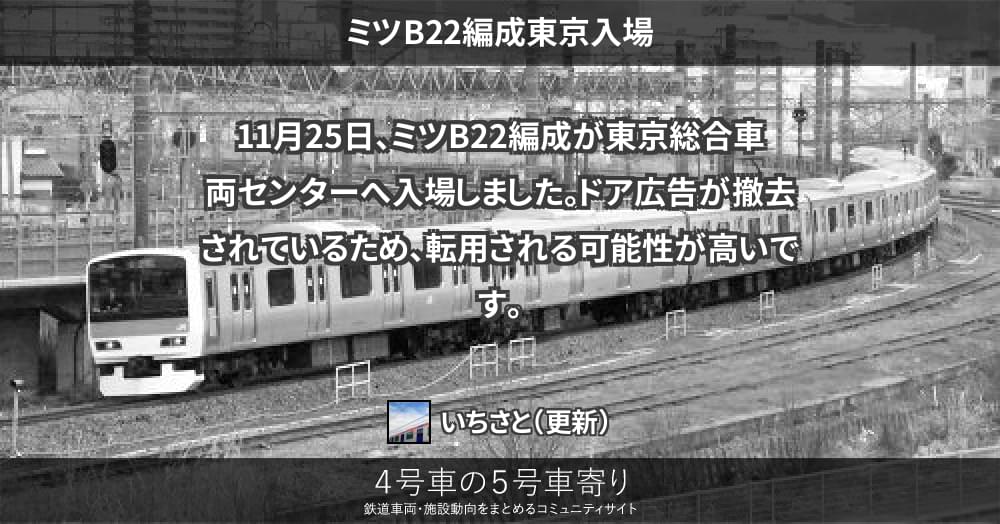 E231系11月25日、ミツB22編成が東京総合車両センターへ入場しました。ドア広告が撤去されているため、転用される可能性が高いです。