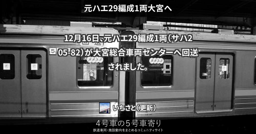 12月16日、元ハエ29編成1両(サハ205-82)が大宮総合車両センターへ回送されました。