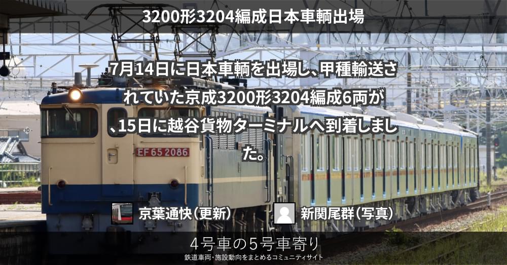 7月14日に日本車輌を出場し、甲種輸送されていた京成3200形3204編成6両が、15日に越谷貨物ターミナルへ到着しました。