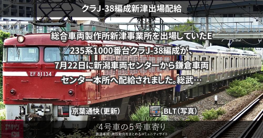 総合車両製作所新津事業所を出場していたE235系1000番台クラJ-38編成が、7月22日に新潟車両センターから鎌倉車両センター本所へ配給されました。