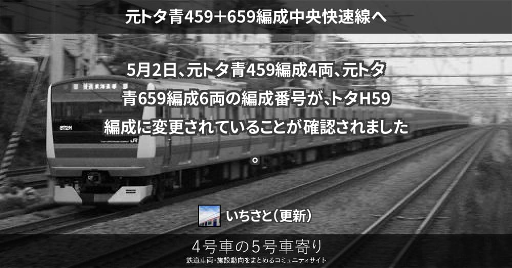 5月2日、元トタ青459編成4両、元トタ青659編成6両の編成番号が、トタH59編成に変更されていることが確認されました。