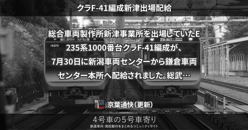 総合車両製作所新津事業所を出場していたE235系1000番台クラF-41編成が、7月30日に新潟車両センターから鎌倉車両センター本所へ配給されました。
